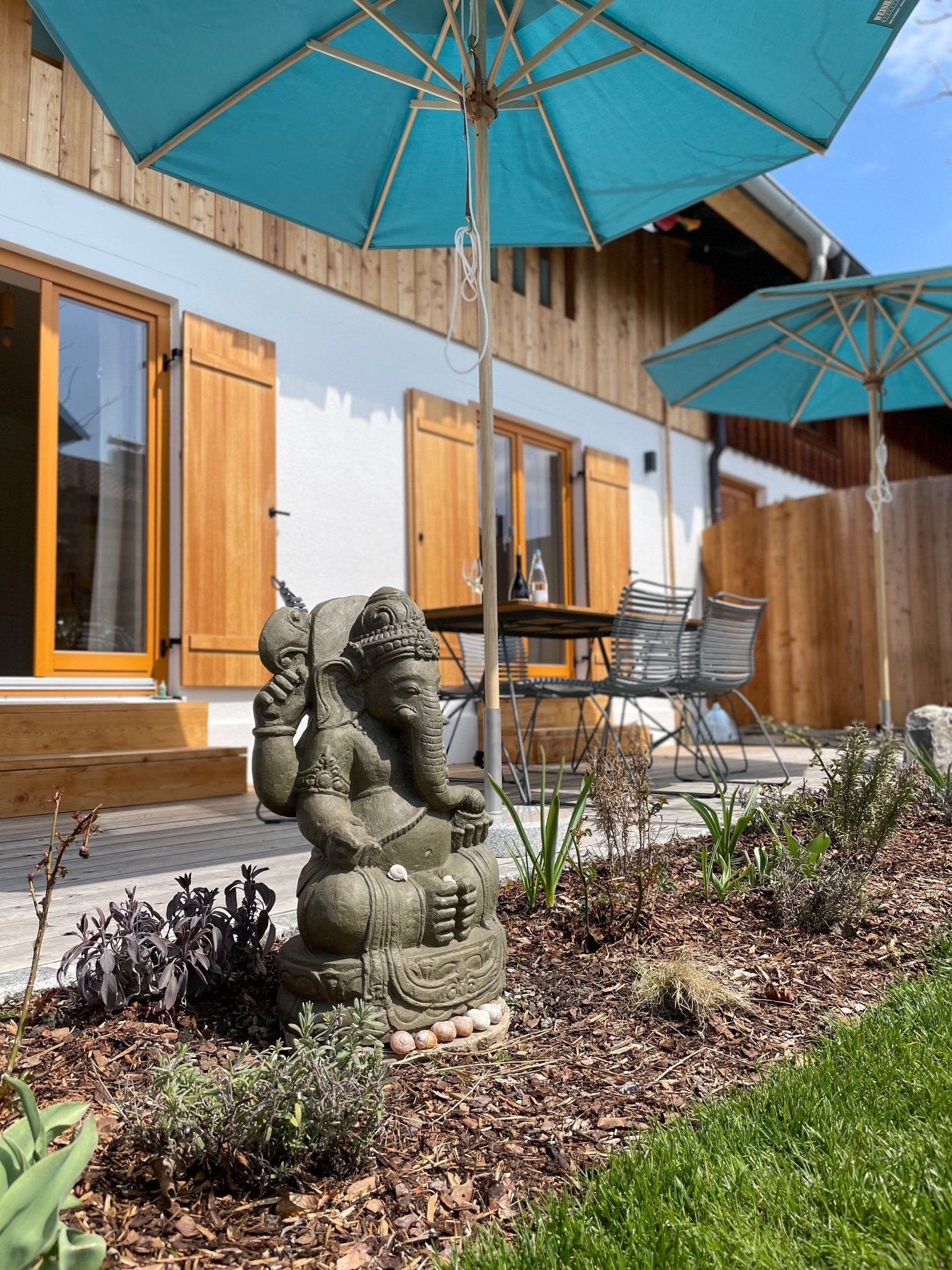 Auf der Sonnenterasse spenden zwei große Sonnenschirme Schatten. Für eine schnelle Abkühlung bietet die Gartendusche oder der nahe See die nötige Erfrischung. Der Garten ist klein aber fein, mit Feuerschale für lauschige Sommerabende. Das Auto steht in der bewachsenen Pergola, da passt auch ein VW-Bus rein. Die BOB fährt nahe dem Haus und der Bahnhof ist ebenfalls in nur 5 Minuten zu Fuß zu erreichen. Unkompliziert und autofrei können Sie so von hier aus das bayrische Oberland oder die Münchner Innenstadt erkunden.